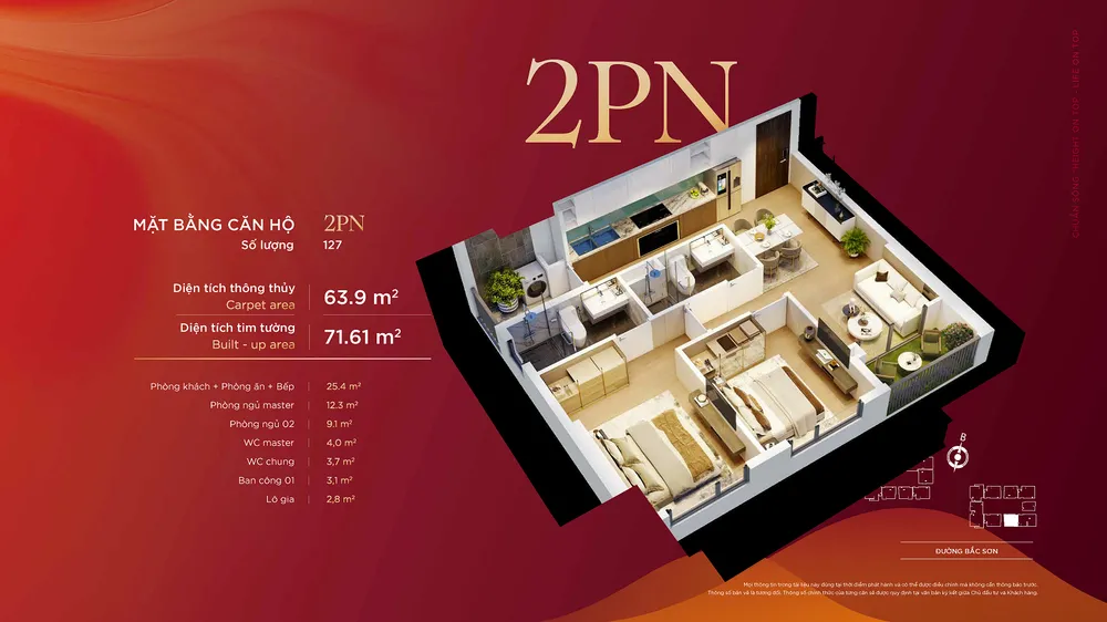 - Căn hộ 2PN: 127 căn, tỷ lệ: 20,9%. Diện tích từ 64,82 – 65,81m2