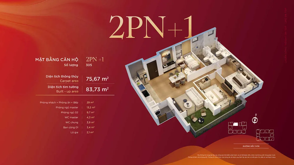 - Căn hộ 2 phòng ngủ + 1: Gồm 305 căn, chiếm 50,2% tổng số căn hộ. Diện tích từ 64,82m2 đến 81,94m2.