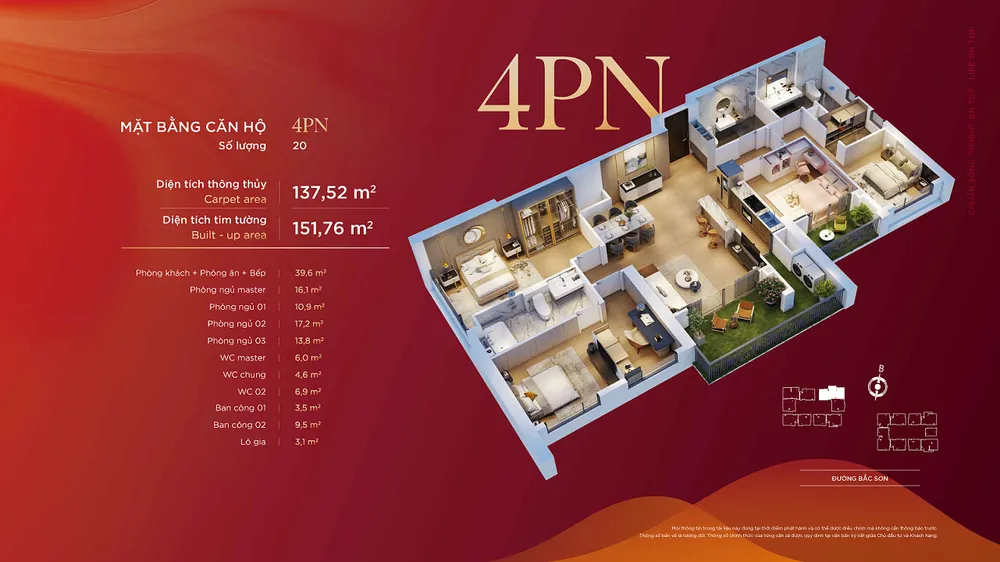 - Căn hộ 4PN: 20 căn, tỷ lệ: 3,2%. Diện tích từ 123,68m2 – 140,34m2