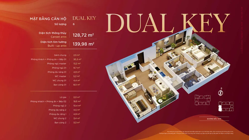 - Căn hộ Dual Key: Gồm 6 căn, chiếm 1% tổng số căn hộ. Diện tích từ 124,93m2 đến 135,13m2.