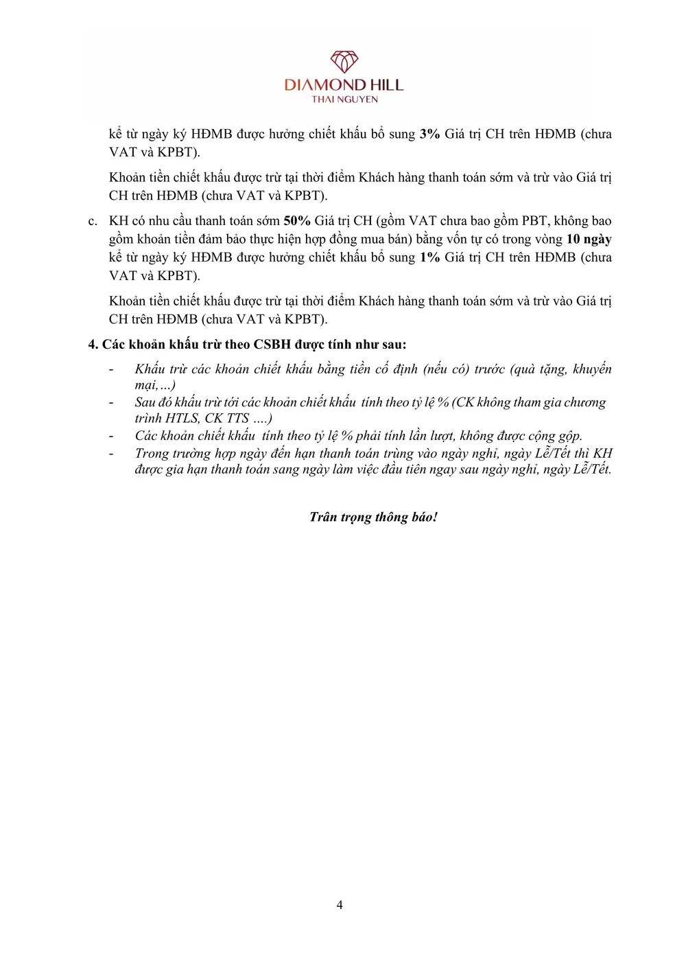 Tất cả mức chiết khấu tính trên giá trị căn hộ (chưa VAT & KPBTT).
