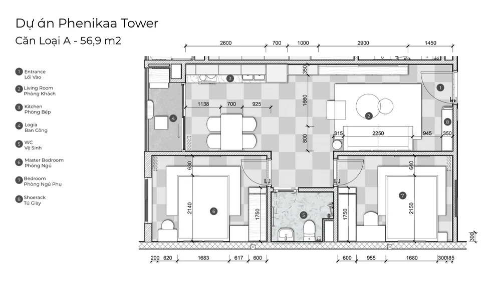 - Căn hộ loại A: diện tích 56,9m²; 2 phòng ngủ – 1 toilet.