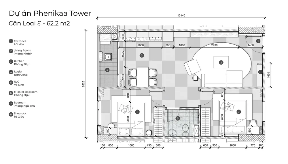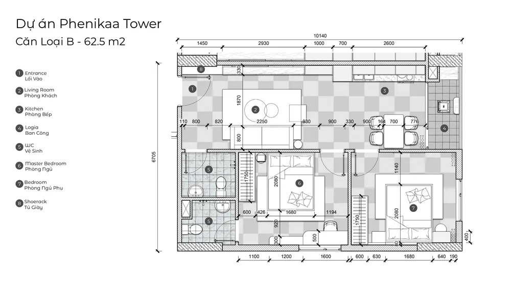 - Căn hộ loại B: diện tích 62,5m²; 2 phòng ngủ – 2 toilet.