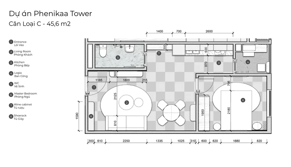 – Căn hộ loại C: diện tích 45,6 m²; 1 phòng ngủ – 1 nhà vệ sinh;