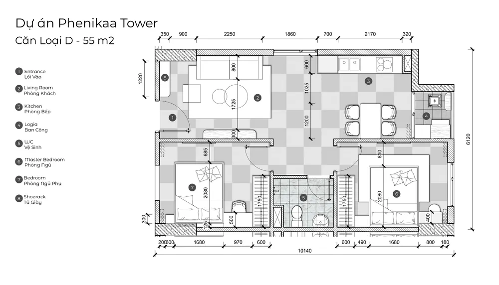 - Căn hộ loại D: diện tích 55m²; 2 phòng ngủ – 1 toilet.