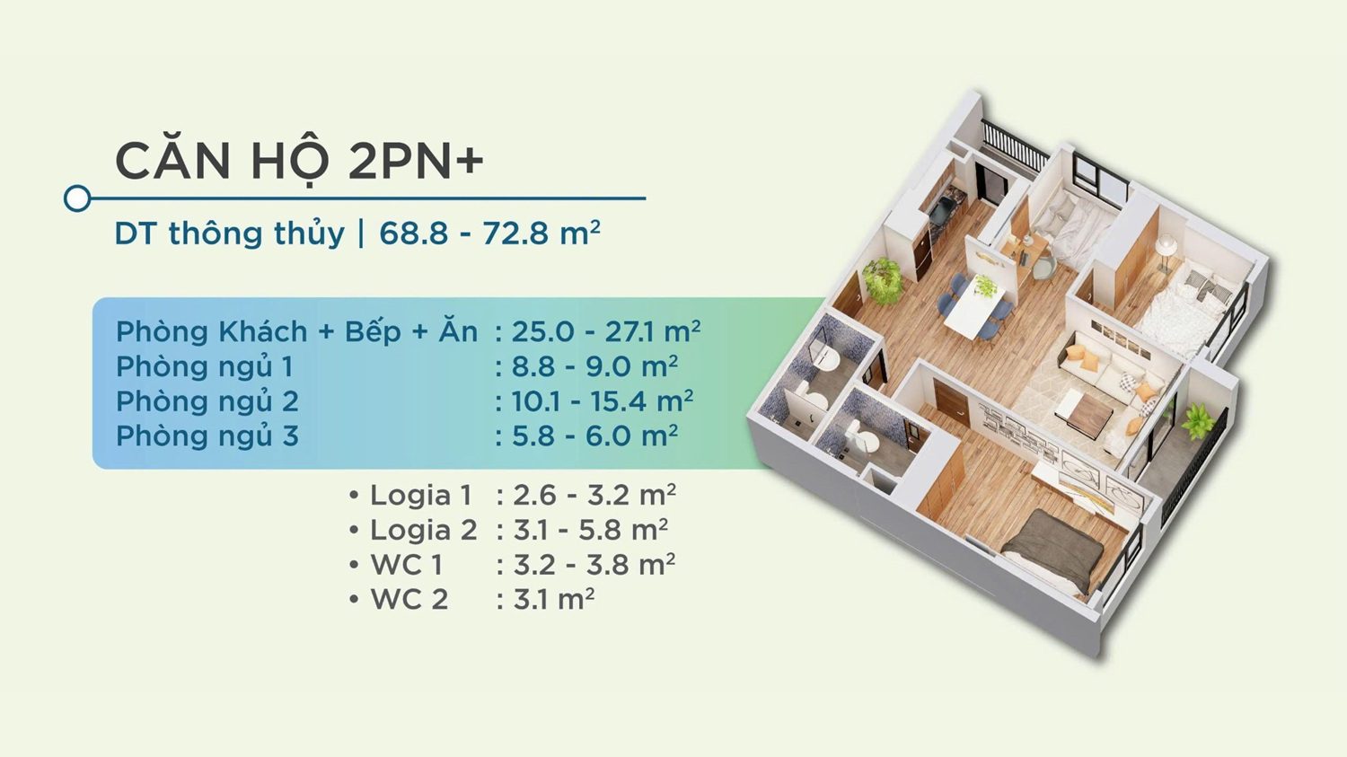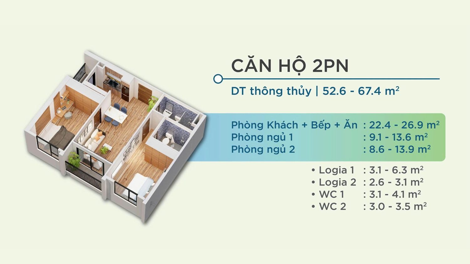 - Căn hộ 2 phòng ngủ: Diện tích từ 57 – 61 m².