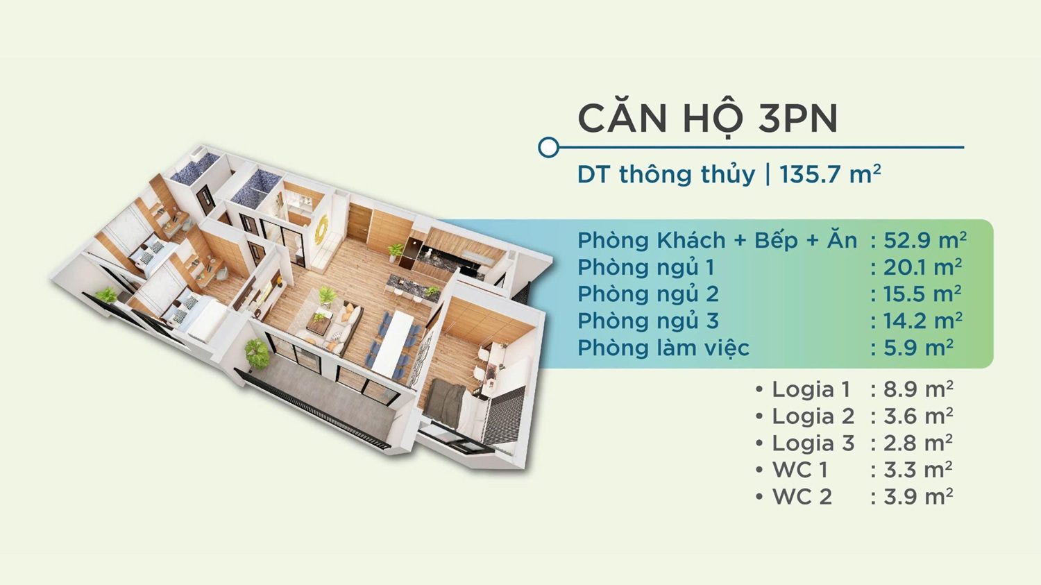 - Căn hộ 3 phòng ngủ: Diện tích khoảng 74 m².